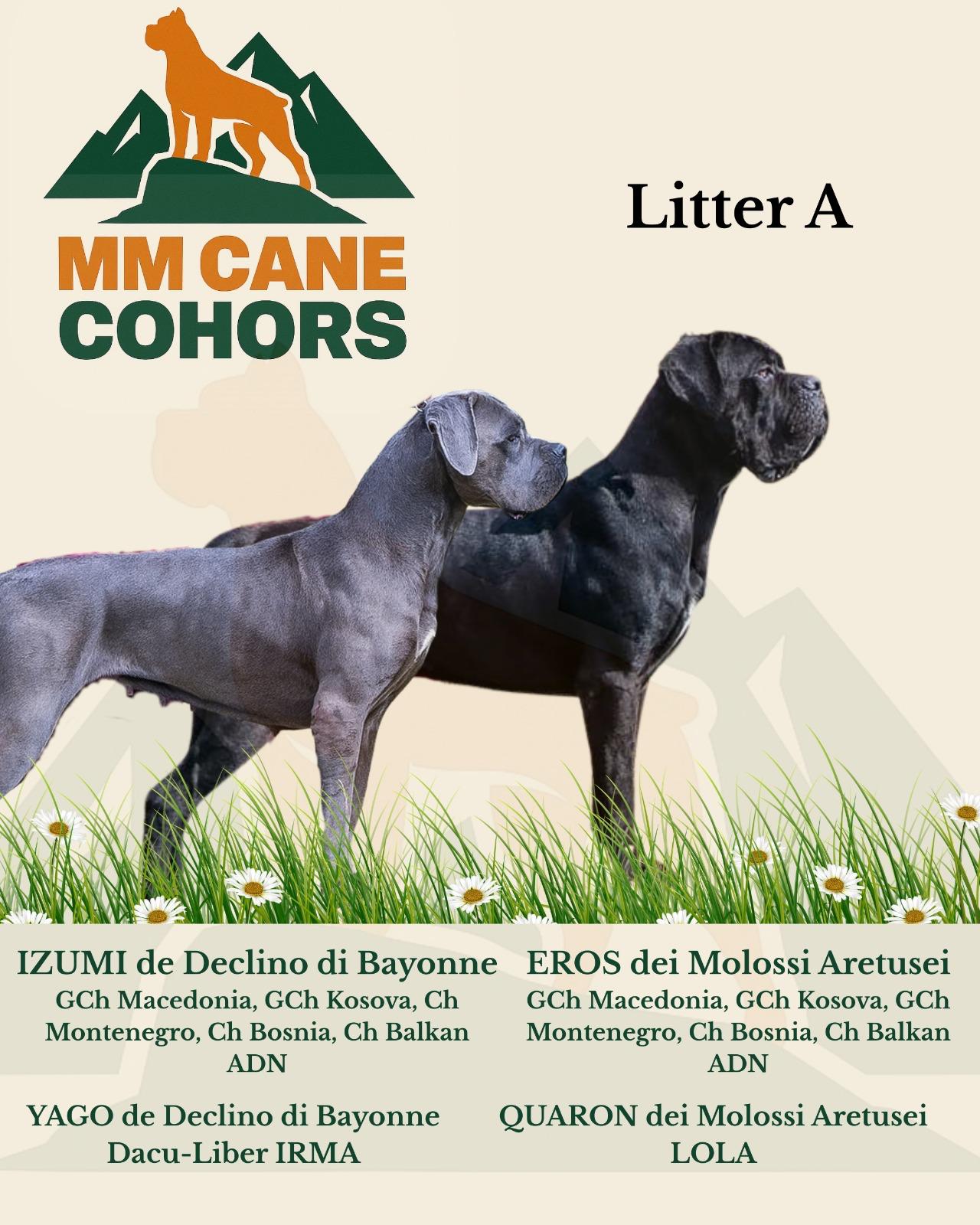 Hijos de Izumi de Declino di Bayonne y Eros dei Molossi Aretusei, esta primera camada (A), está formada por 4 machos y 1 hembra.